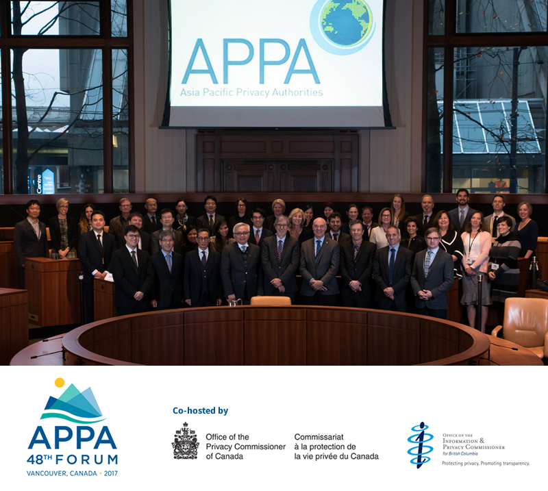 The Office of the Privacy Commissioner of Canada (OPC-Canada) and the Office of the Information and Privacy Commissioner for British Columbia (OIPC-BC) co-hosted the 48th Asia Pacific Privacy Authorities (APPA) Forum on 16 to 17 November 2017 in Vancouver, Canada. A kick-off event was also organized on 15 November, highlighting the benefits of independent research in privacy, while showcasing results of the OPC-Canada’s Contribution Program.
